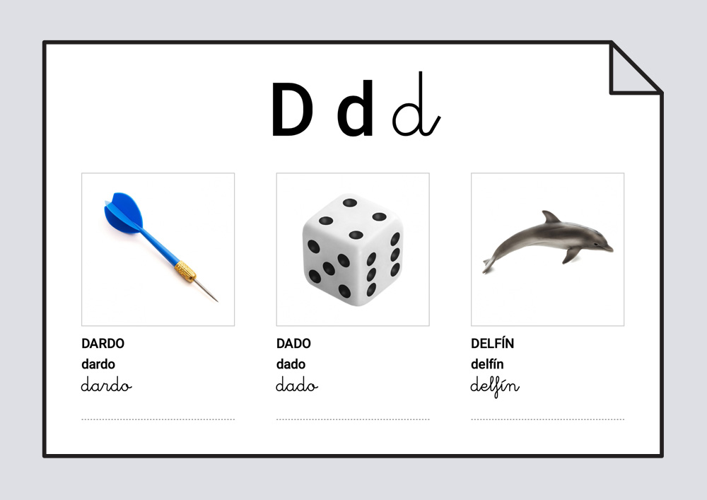 Abecedario, elaborado con fotografías. Cada página de este material corresponde a una letra, la cual está acompañada de tres imágenes de cosas que empiezan por dicha letra. Se invita a leer y escribir cada palabra.