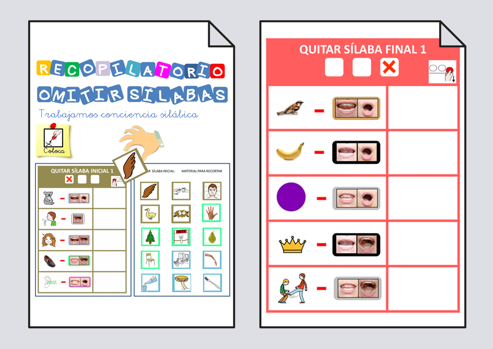 Materiales de repaso que comprenden recopilatorios de ejercicios para manipular las sílabas y formar palabras, añadiendo o quitando sílabas a otras palabras.