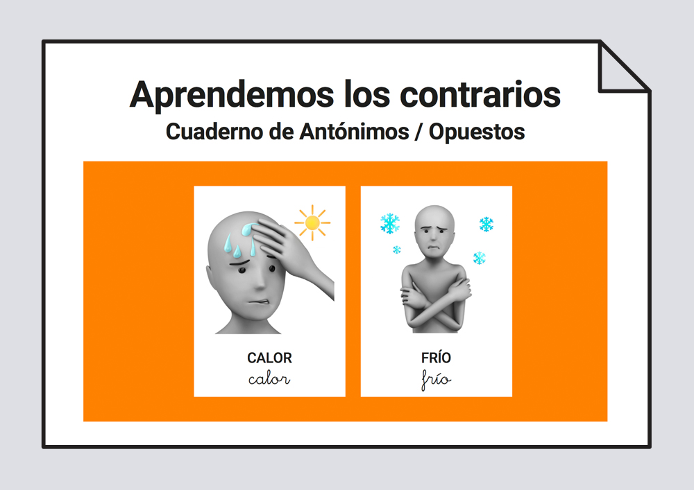 Cuaderno para trabajar el léxico en torno a las palabras antónimas, opuestos o contrarios. El material está compuesto por parejas de contrarios enfrentados, con fotografías referidas a adjetivos, adverbios o acciones frecuentes en la vida cotidiana.