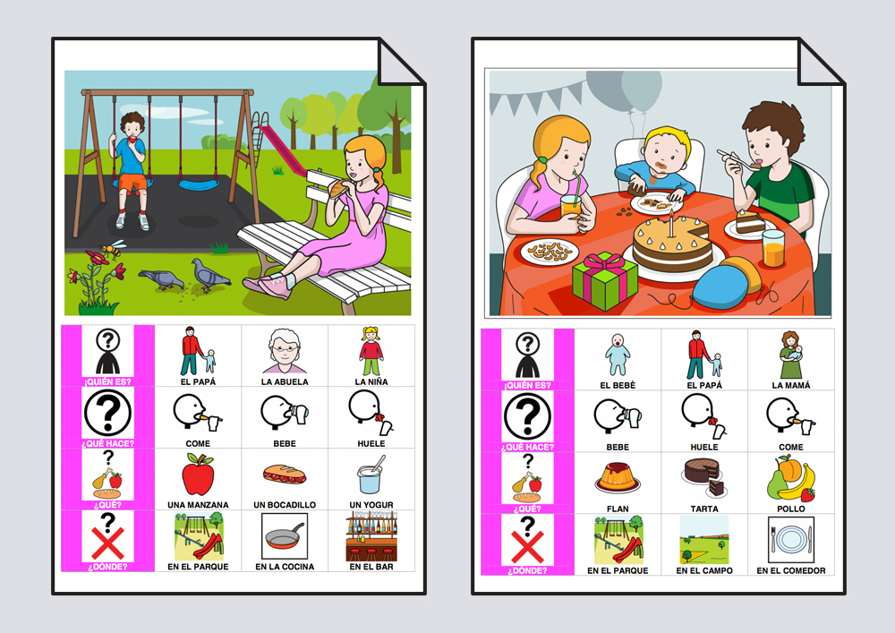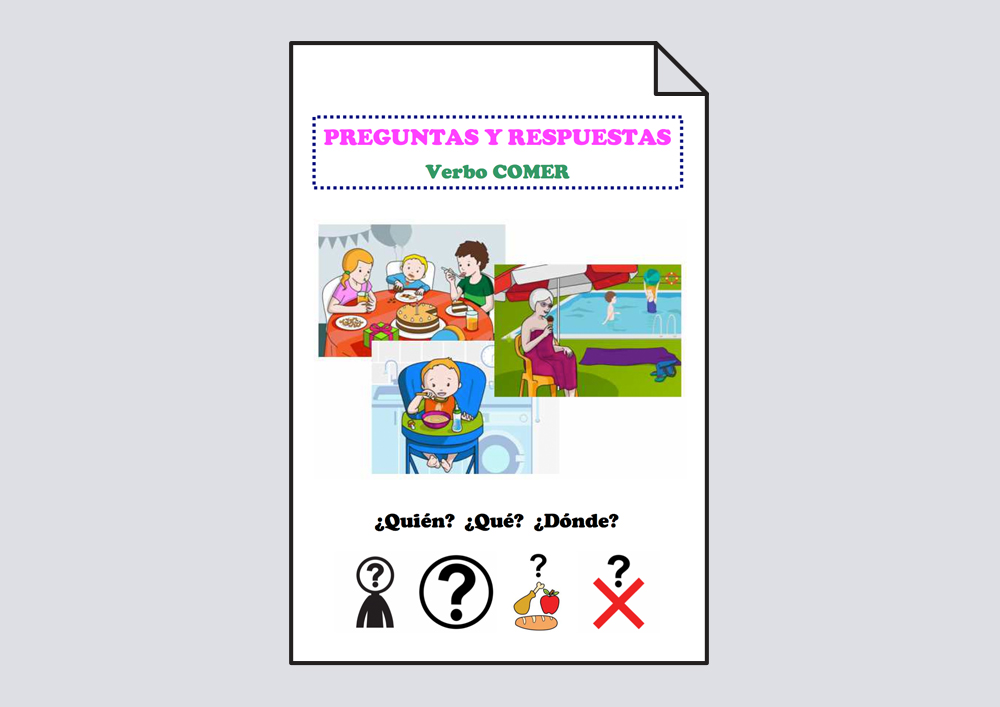 Material para aprender a responder a los pronombres interrogativos ¿Quién?, ¿Qué? y ¿Dónde? a partir de las láminas de verbo COMER.