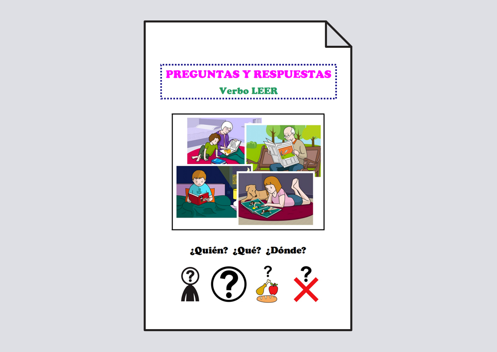 Material para aprender a responder a los pronombres interrogativos ¿Quién?, ¿Qué? y ¿Dónde? a partir de las láminas de verbo LEER.