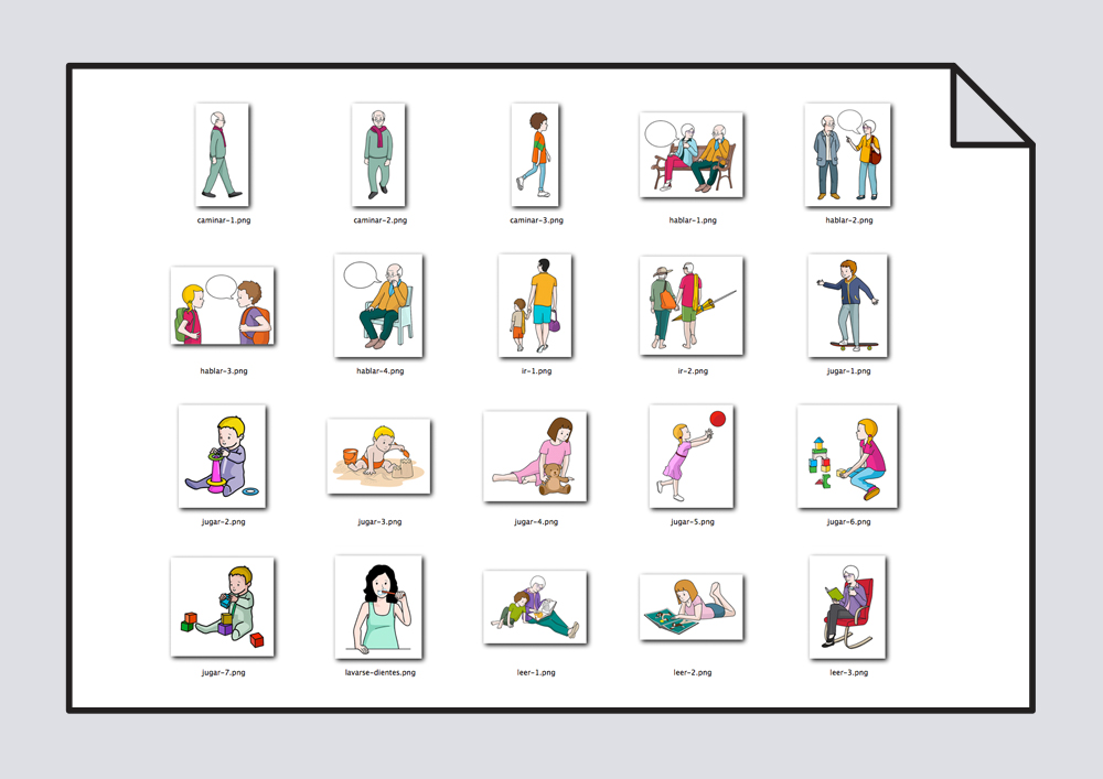 La biblioteca de acciones es un conjunto de ilustraciones, facilitadas en formato PNG de alta resolución y con fondo transparente. Los usuarios de este tipo de materiales podrán utilizar cada personaje y situarlo en cualquier fondo o contexto para crear diseños personalizados. El material está compuesto de 20 ilustraciones.