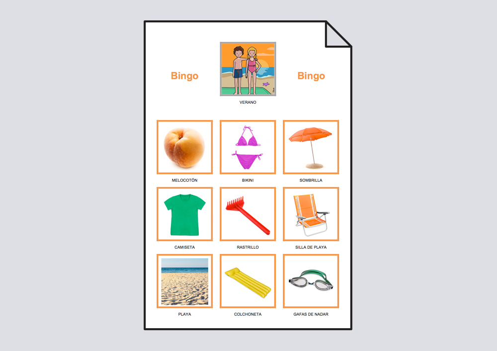 Bingo sobre el verano compuesto por tres cartones y nueve objetos en cada uno de ellos.