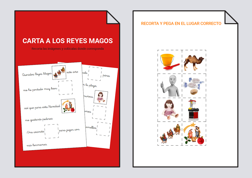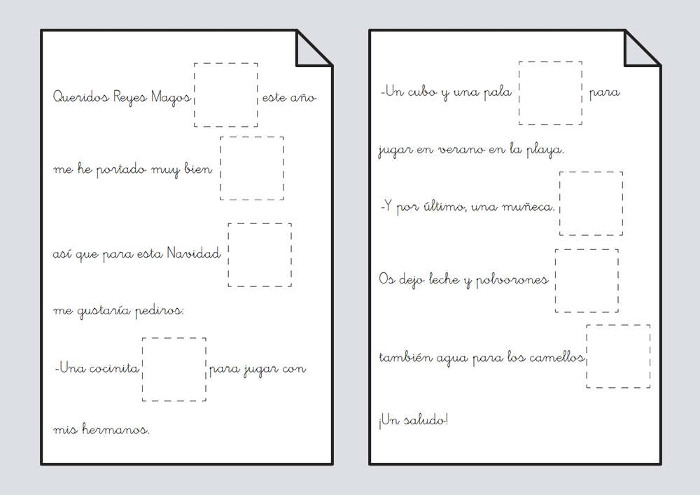 Material de lectoescritura en el que se debe rellenar los huecos de una carta a los Reyes Magos con las imágenes correspondientes.