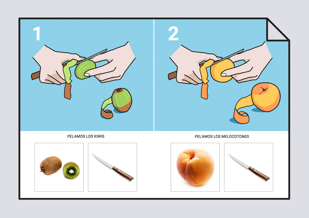 Receta realizada con ilustraciones y fotografías para mostrar paso a paso la realización de una brocheta de fruta.