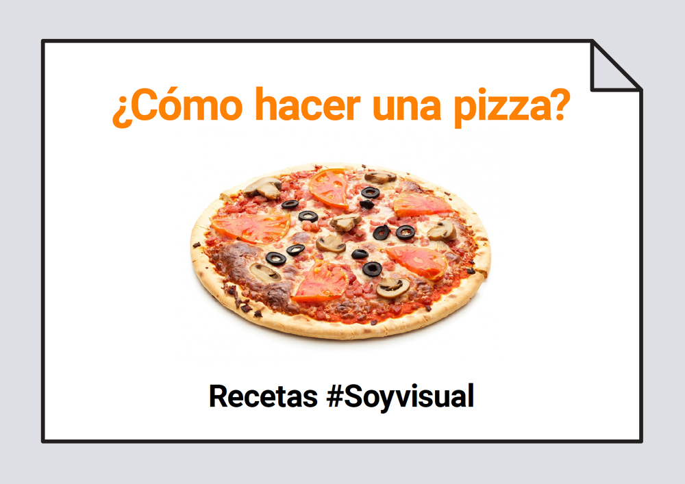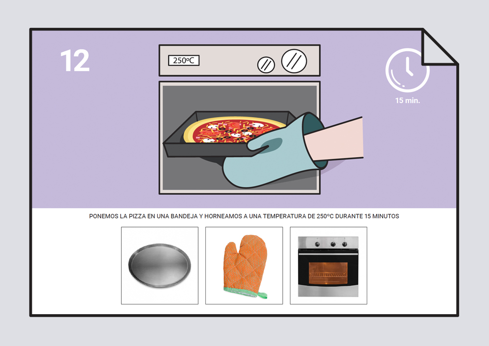 Receta realizada con ilustraciones y fotografías para mostrar paso a paso la realización de una pizza.