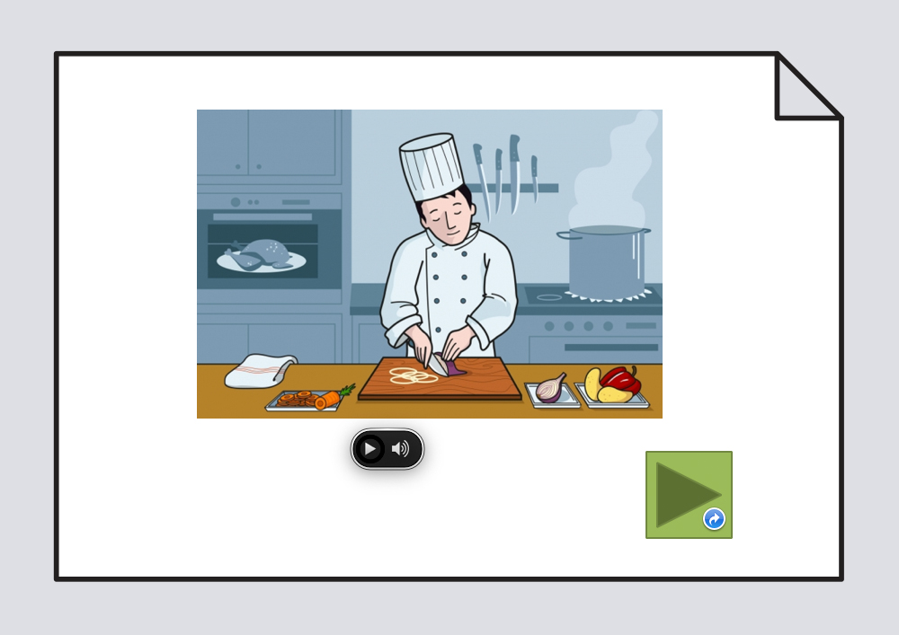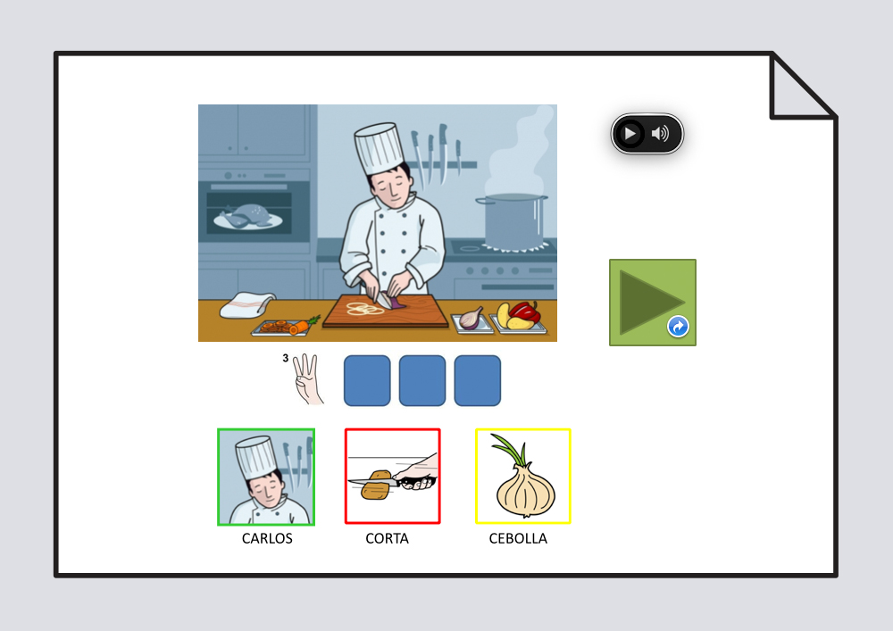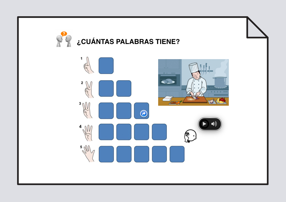 Se presenta una lámina con una escena y una voz dice una frase relacionada con ella. El niño debe reconocer la cantidad de palabras que componen la frase y señalarlo en la pantalla siguiente.