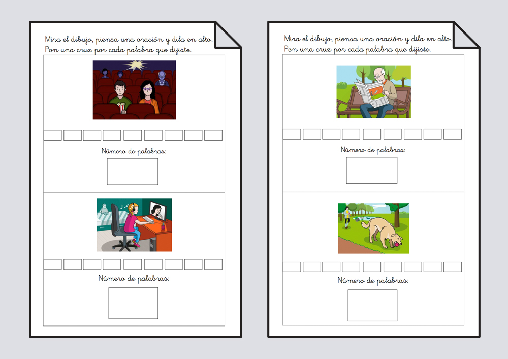 Material para trabajar la conciencia léxica pensando una frase con una lámina ilustrada como referencia y escribiendo palabras. Una vez que hemos pensado la frase la diremos en alto, poniendo por cada palabra que emitimos una cruz.