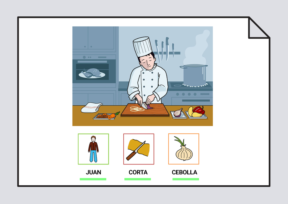 3. Omitir palabras de la oración. Con una X hecha con plástico o algo transparente (de manera que el alumnado pueda ver que estamos tapando una palabra) iremos quitando partes de la oración y el alumnado tendrá que decir el resto. Resulta más fácil empezar quitando la última, luego la primera, y en último lugar, la del centro (verbos).