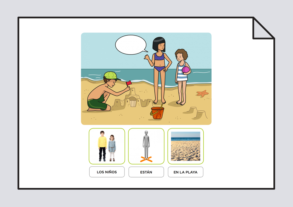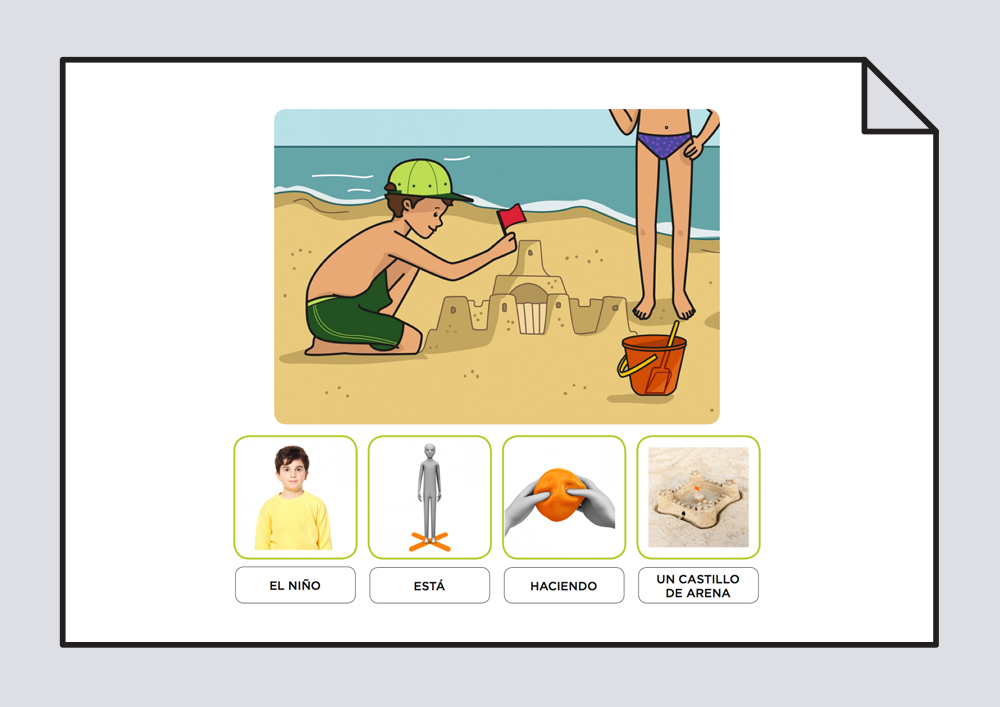 Material para trabajar la construcción de frases y la lectoescritura a partir de una lámina ilustrada. Las frases se generan en torno a una escena y nos ayudan a comprender lo que está ocurriendo. "Los niños están en la playa", "Los niños están jugando en la playa", "El niño está haciendo un castillo de arena con el cubo y la pala", etc.