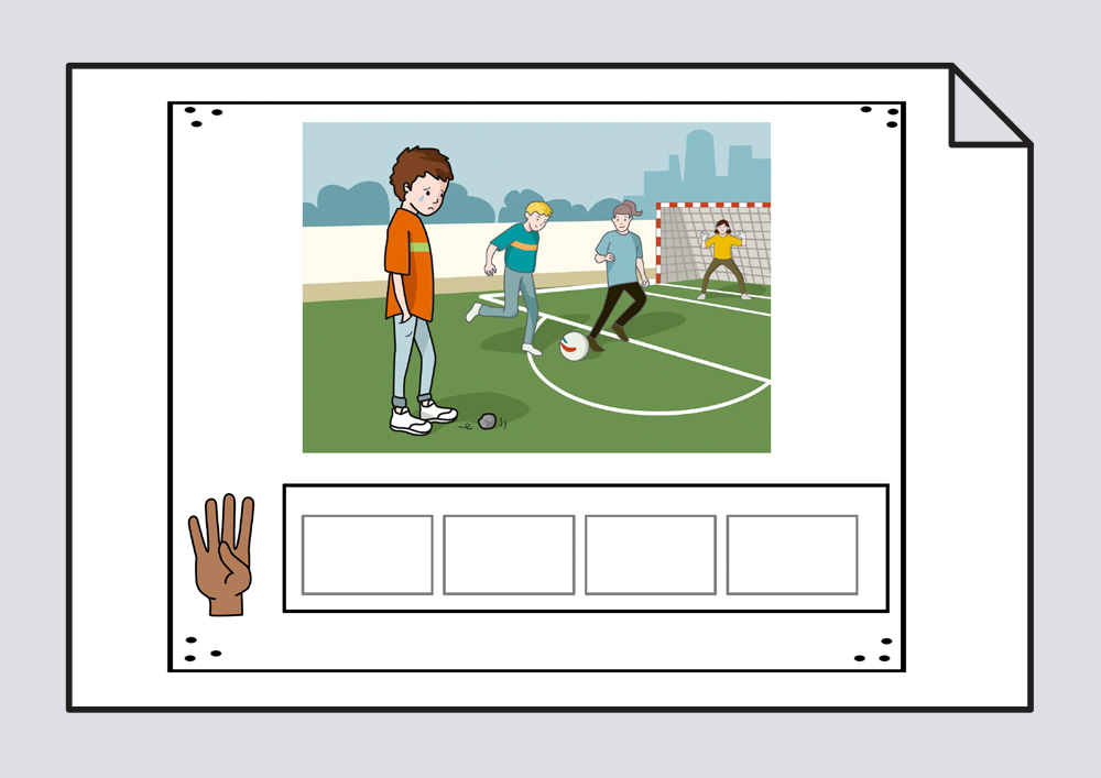 Material para la construcción de frases que consiste en crear oraciones con un determinado número de elementos, a partir de una lámina ilustrada. Se sugiere una lista e oraciones para el alumnado.