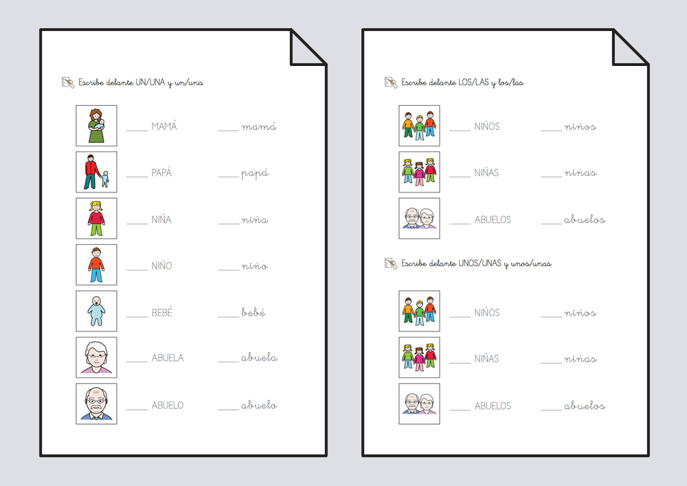 Cuadernillo de actividades para trabajar la lectoescritura a partir de una lámina ilustrada con una familia, utilizando los recursos disponibles en #Soyvisual y en Arasaac. Disponible en letra cursiva y en mayúsculas.