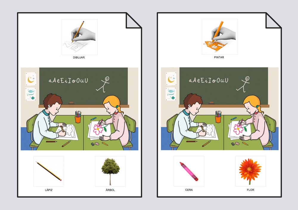 Material para trabajar el vocabulario entorno a las acciones de dibujar y pintar, basado en un diccionario de fotografías correspondiente a material escolar.