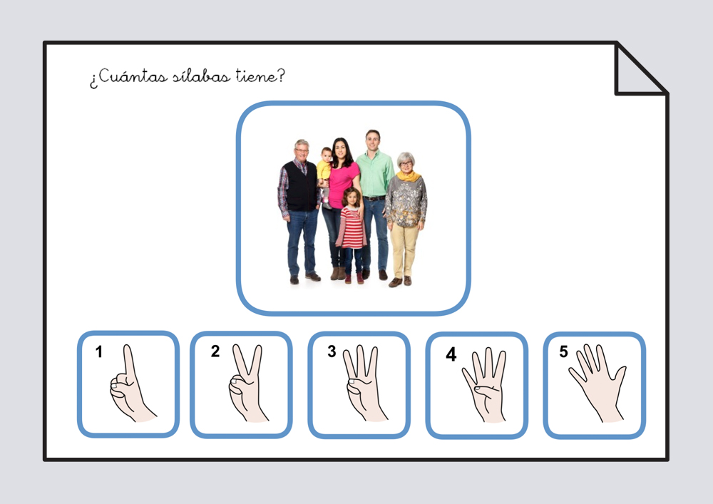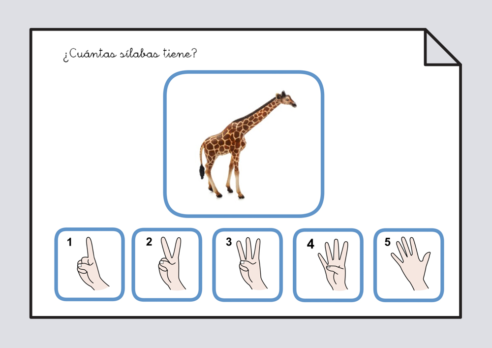 Actividad basada en la conciencia silábica del fonema F. Consiste en contar las sílabas que tiene una palabra y posteriormente buscar el sonido silábico marcado, que puede estar en sílabas en posición inicial, media o final, dependiendo de cada palabra y del sonido buscado.