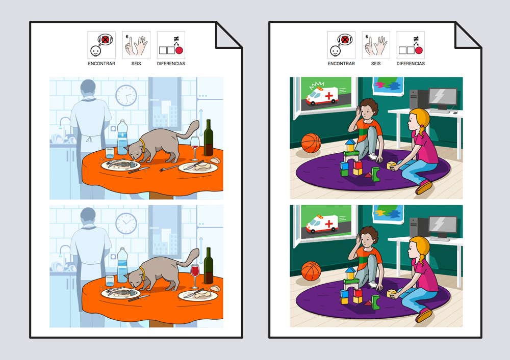 Material con cuatro ejemplos para trabajar la atención y la discriminación visual mediante la presentación de dos láminas iguales, en las que se han cambiado algunos elementos y que el usuario deberá localizar. El material ofrece también una hoja con las soluciones.