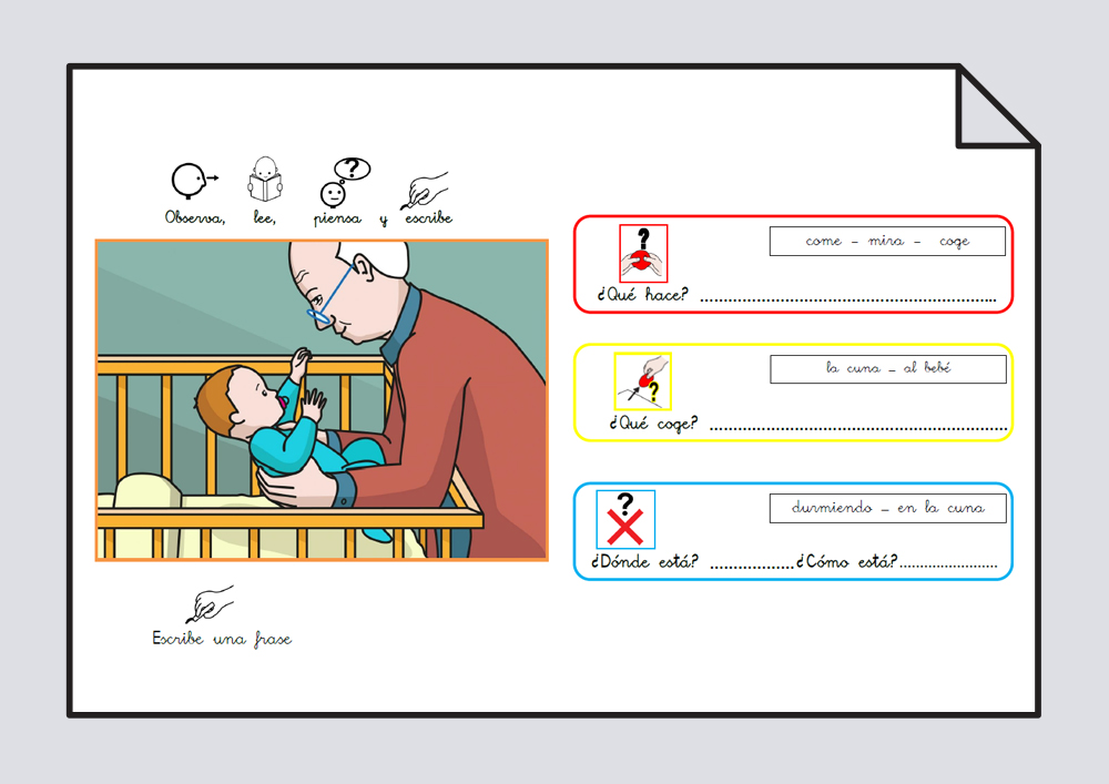 Conjunto de fichas para trabajar la estructuración correcta de la frase, así como la compresión y expresión oral y escrita, a través de la combinación de pictogramas ee ARASAAC y láminas de #soyvisual