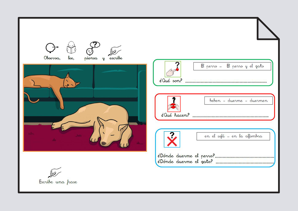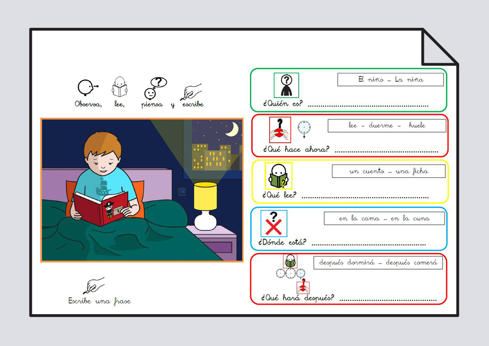 Conjunto de fichas para trabajar la estructuración correcta de la frase, así como la compresión y expresión oral y escrita, a través de la combinación de pictogramas ee ARASAAC y láminas de #soyvisual