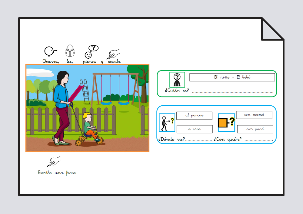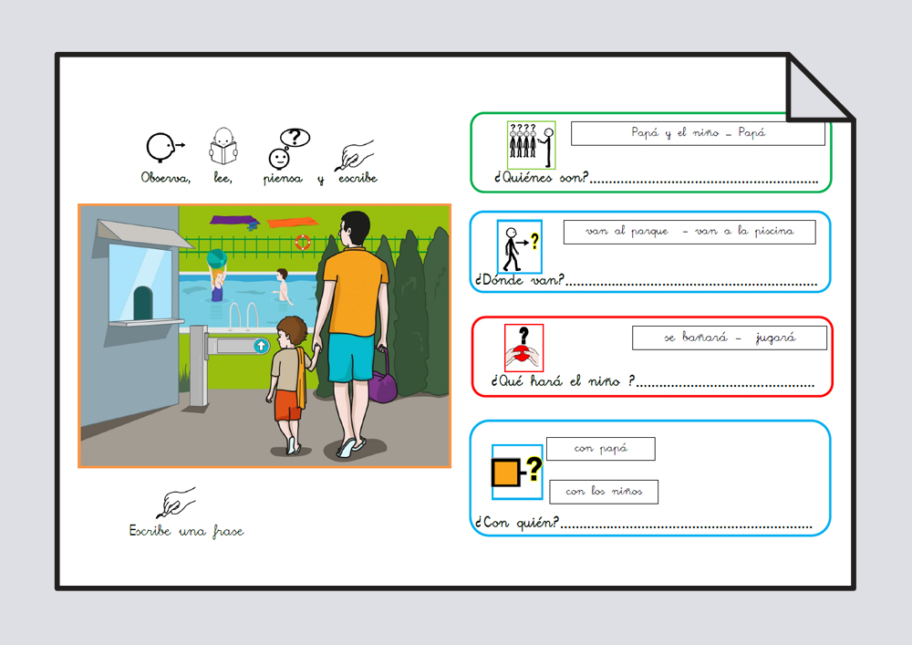 Conjunto de fichas para trabajar la estructuración correcta de la frase, así como la compresión y expresión oral y escrita, a través de la combinación de pictogramas ee ARASAAC y láminas de #soyvisual
