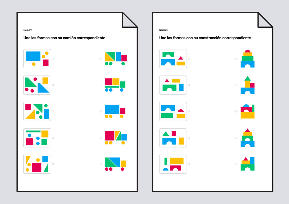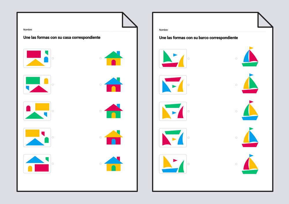 Fichas para trabajar la atención con formas y colores. Consiste en identificar y unir las formas de la izquierda con los objetos correspondientes de la derecha.