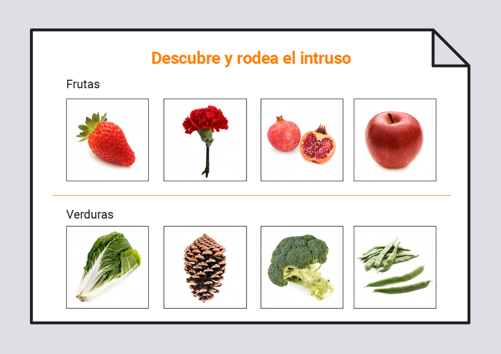 Material para trabajar la clasificación del vocabulario, diferenciando los elementos que pertenecen, o que no pertenecen a una categoría dada y utilizando la búsqueda del intruso.