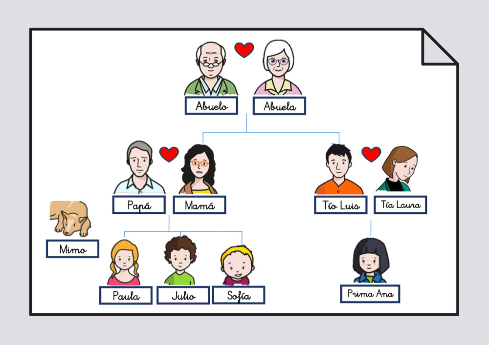 Material manipulativo para trabajar el vocabulario en torno a los diferentes miembros que constituyen una familia y las relaciones de parentesco que existen entre ellos.