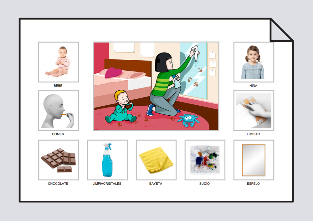 Material para trabajar la identificación y adquisición de vocabulario en torno a la lámina "La niña limpia el espejo". Incluye 2 fichas con fotografías de #Soyvisual y pictogramas de Arasaac respectivamente para trabajar la transición entre la realidad, la fotografía y pictograma.