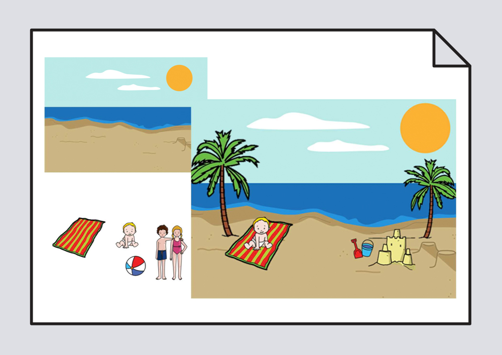 Material para trabajar el vocabulario en torno a la playa, usando objetos y personajes con fondo transparente.