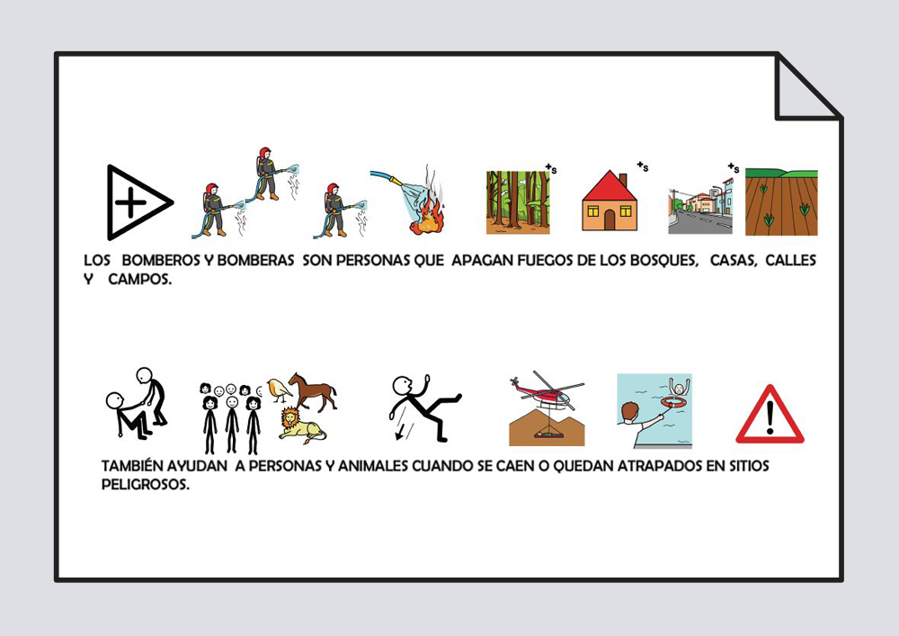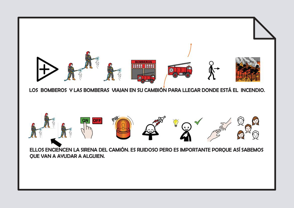 Libro con láminas ilustradas, pictogramas y fotografías para anticipar la visita al parque de bomberos y trabajar el vocabulario, la comprensión y expresión oral relacionado con este centro de interés.