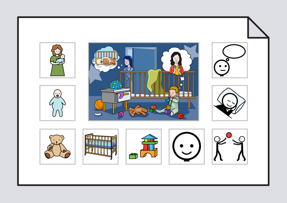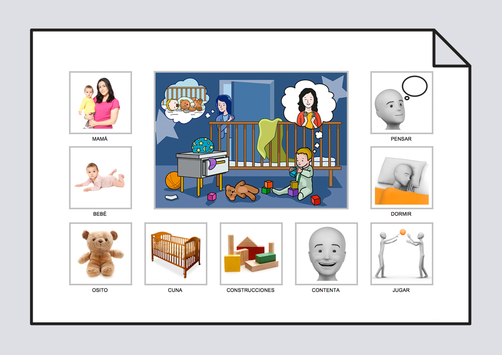 Material para trabajar la identificación y adquisición de vocabulario en torno a la lámina "Mamá piensa que el bebé está dormido". Incluye 2 fichas con fotografías de #Soyvisual y pictogramas de Arasaac respectivamente para trabajar la transición entre la realidad, la fotografía y pictograma.