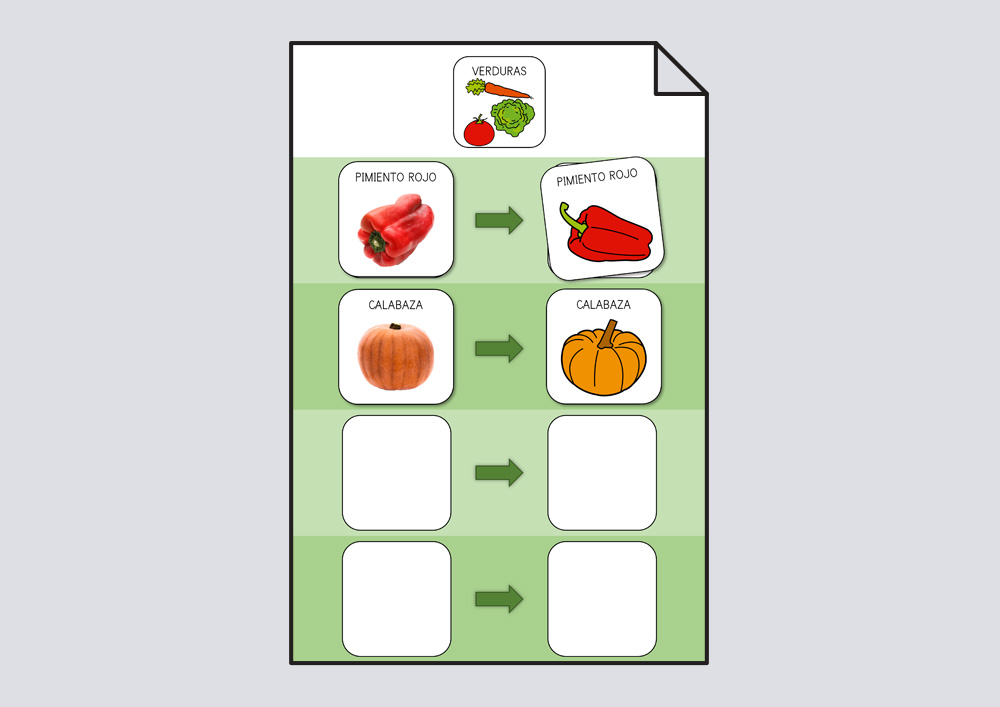 Hojas para crear libro en relación al campo semántico de las verduras para la transición de foto real a pictogramas.