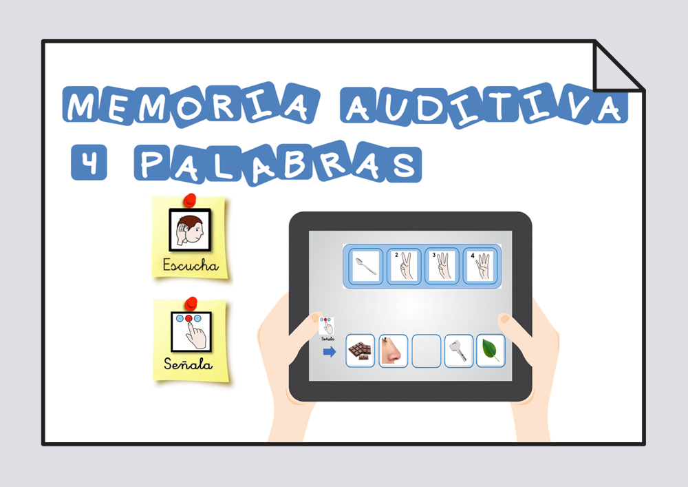 Material para mejorar y desarrollar la memoria auditiva de cuatro palabras. Se trata de recordar, de forma ordenada, series de cuatro palabras en orden directo. Se le presentan al niño/a cuatro palabras de manera auditiva y después el niño/a deberá señalar en la diapositiva las palabras escuchadas en el mismo orden que las ha oído previamente.