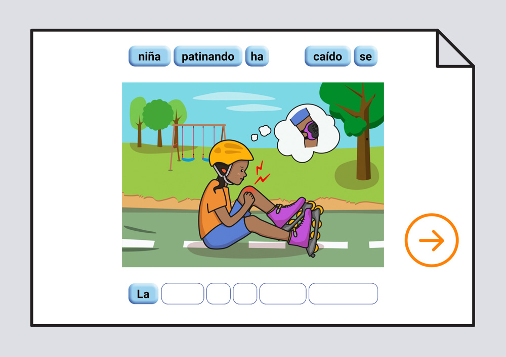 Material interactivo para trabajar la ordenación correcta de las palabras escritas que componen una frase, representada por una lámina.