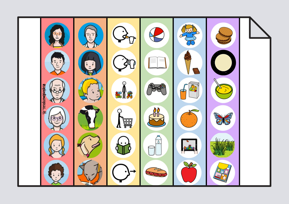 Colocando sobre los círculos de la plantilla del Pop It los pictogramas - distribuidas por categorías sintácticas y de acuerdo al código de color del Pop It- se tienen que construir frases con los tres elementos principales de una oración, sujeto, verbo y complemento.