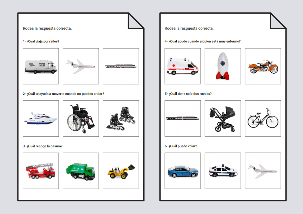 El material consta de unas fichas iniciales de vocabulario donde se asocian fotografías de transportes con el medio donde se utiliza. Después, el alumno debe unir esos transportes con fotografías relacionadas y por último se debe responder a una serir de preguntas relacionadas con ellos.
