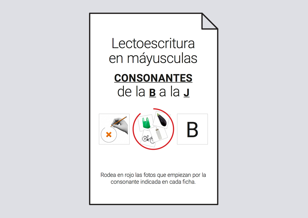 Material para trabajar de forma progresiva la lectoescritura en torno a las consonantes (de la b a la j) escritas en mayúsculas.