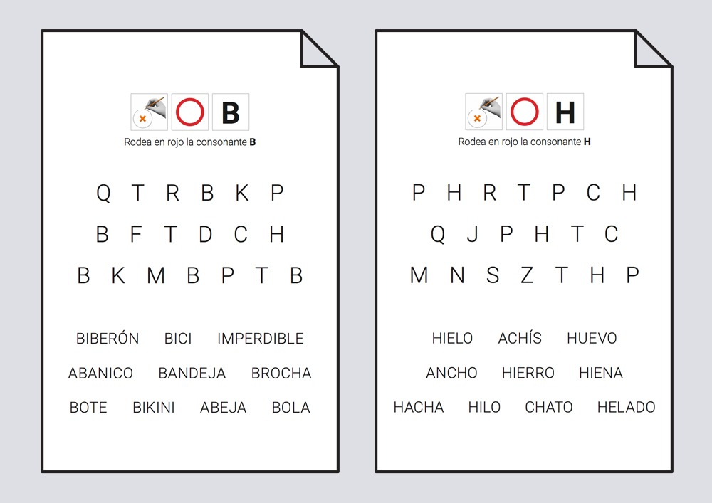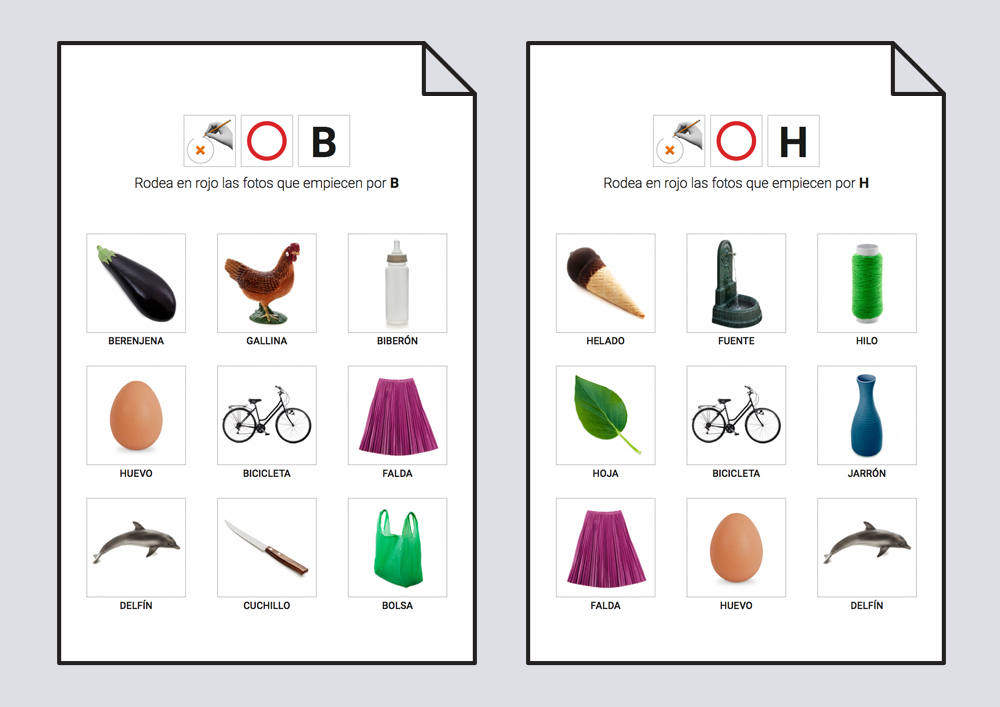 En el primer tipo se proponen fotografías, con palabras escritas, que empiezan por diferentes consonantes y se ha de rodear las que empiezan por la consonante indicada en cada ficha. En un segundo paso se suprimen las fotografías y se plantean únicamente palabras escritas. En este caso se rodean las consonantes solicitadas en cada ficha.