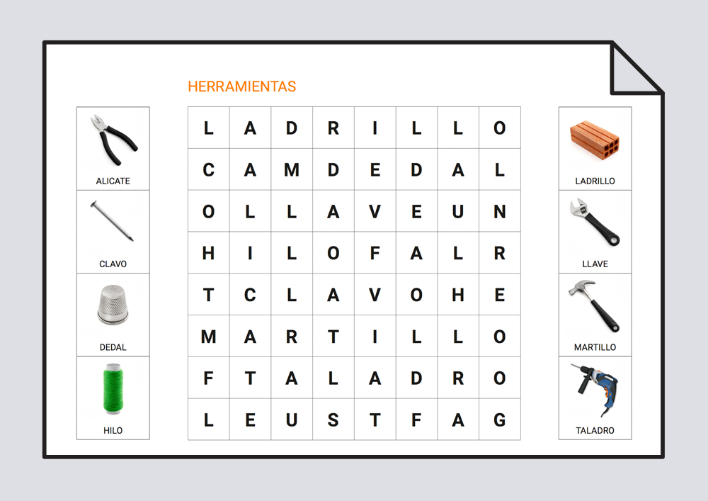 Material compuesto de 4 sopas de letras, separadas en archivos diferentes y cada uno de ellos corresponde a una categoría de vocabulario diferente: animales, frutas, herramientas y ropa. Además se facilita un archivo independiente con las soluciones a las 4 sopa de letras.
