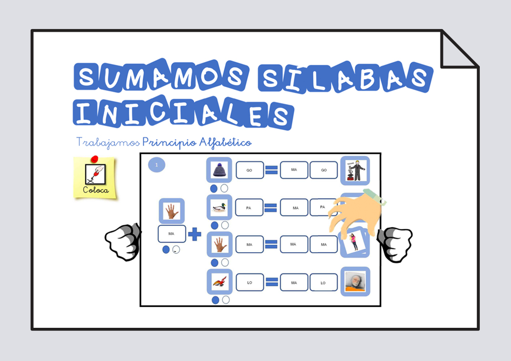 Esta actividad consiste en que el niño/a identifique la sílaba inicial de una palabra, la transcriba a letras, a continuación busque la sílaba inicial de otra palabra, la transcriba a letras y forme la palabra nueva que sale. En este caso escribiendo las dos sílabas que la forman y por último ha de colocar la imagen que se corresponde con esa palabra.