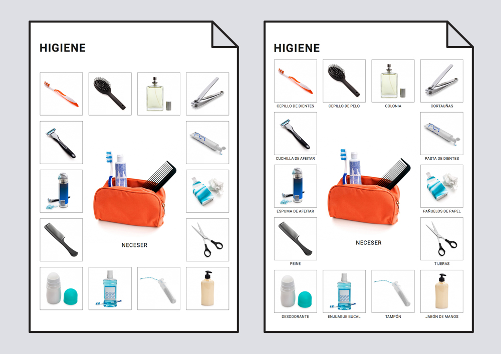 Tableros de comunicación sobre la higiene, el neceser y los objetos que se meten en él.