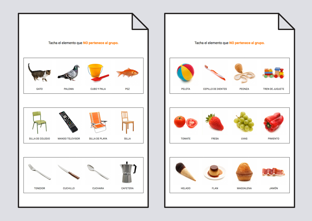 Material para trabajar la pertenencia o no pertenencia de un objeto a una categoría de vocabulario dada.
