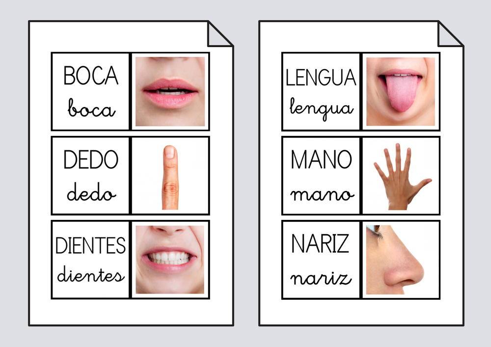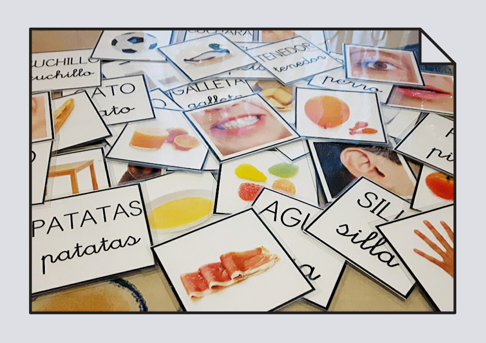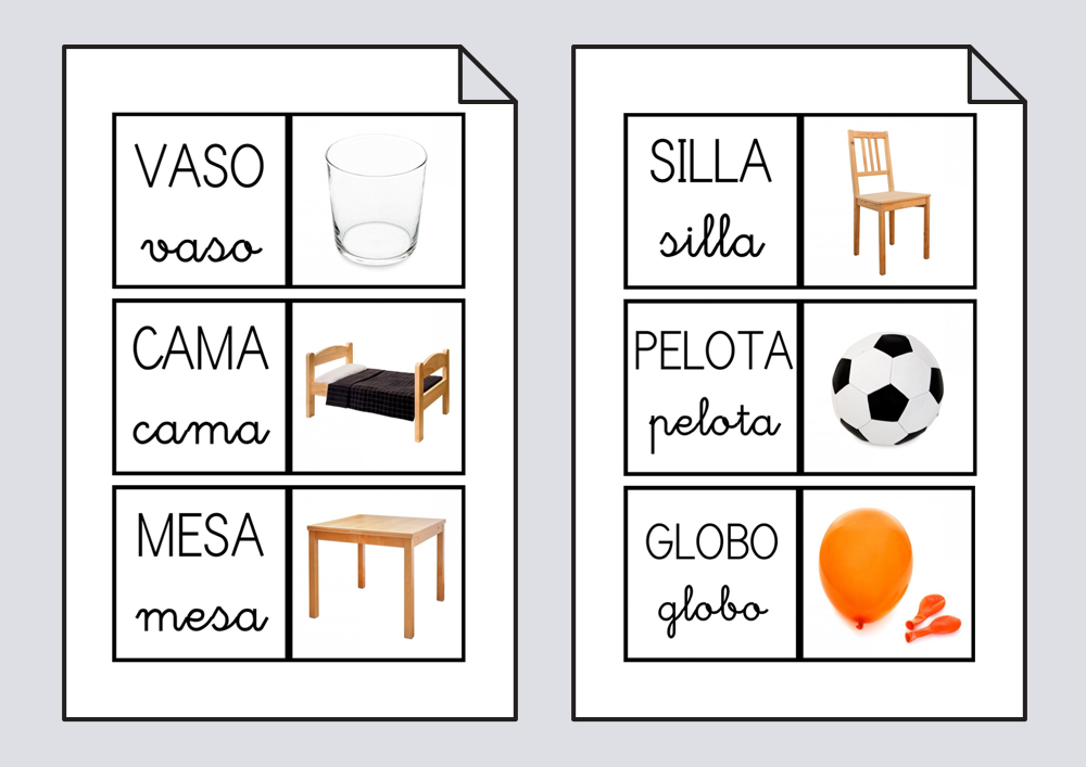 Material para trabajar el vocabulario básico y la lectura (mayúsculas y letra escolar) a partir de tarjetas. Recortar por los bordes y doblar las tarjetas de manera que en una cara quede la fotografía y en la otra la palabra.