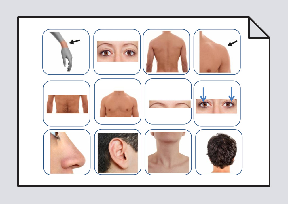 Material para identificar mediante tarjetas recortables las diferentes partes del cuerpo humano.