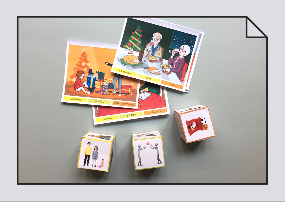 Material lúdico para aprender a construir frases de estructura sujeto+verbo+complemento, utilizando láminas de referencia y tres cubos que contienen personas, acciones y sustantivos en cada una de sus caras. Podemos utilizarlo de forma dirigida, mostrando la lámina y el usuario busca la fotografía correspondiente en cada uno de los cubos para formar la frase correcta. También, podemos utilizarlo de forma lúdica, haciendo que el usuario lance los cubos y construya la frase con las fotografías que han salido aleatoriamente; le pediremos que evoque la frase e identifique si es una frase coherente o incoherente.