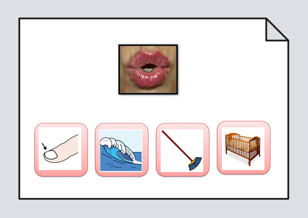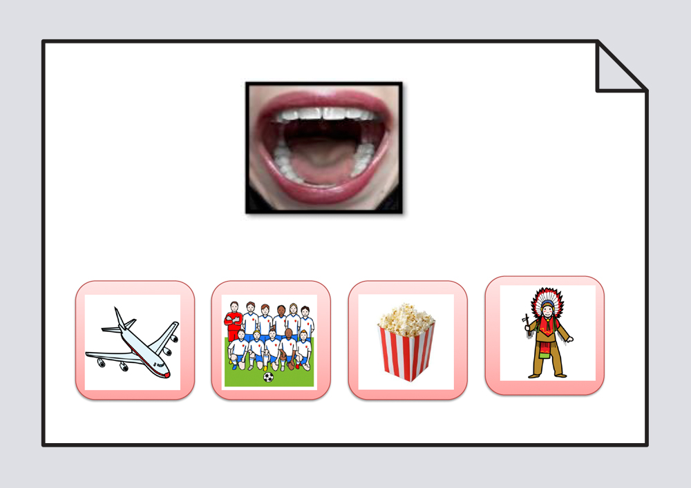 Material para trabajar la conciencia fonémica de las vocales. La palabra buscada empieza por una vocal concreta, representada por la fotografía de una boca en la posición que se tiene para nombrar dicha vocal.