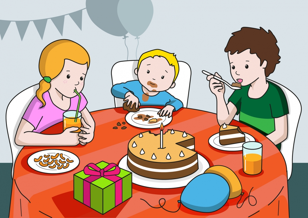En la escena, se observa a varios niños celebrando un cumpleaños en el comedor de su casa. La niña bebe un zumo de naranja y el niño come tarta de chocolate. El bebé coge con las manos un trozo de tarta y se la come. En la escena, se observan alimentos y utensilios relacionados con la comida.