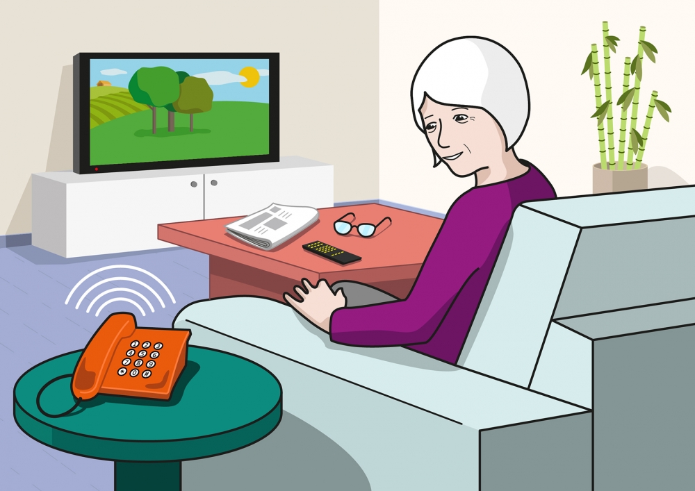 En la escena, se observa a una persona mayor sentada en un sillón del salón, que gira la cabeza hacia el teléfono que está sonando.