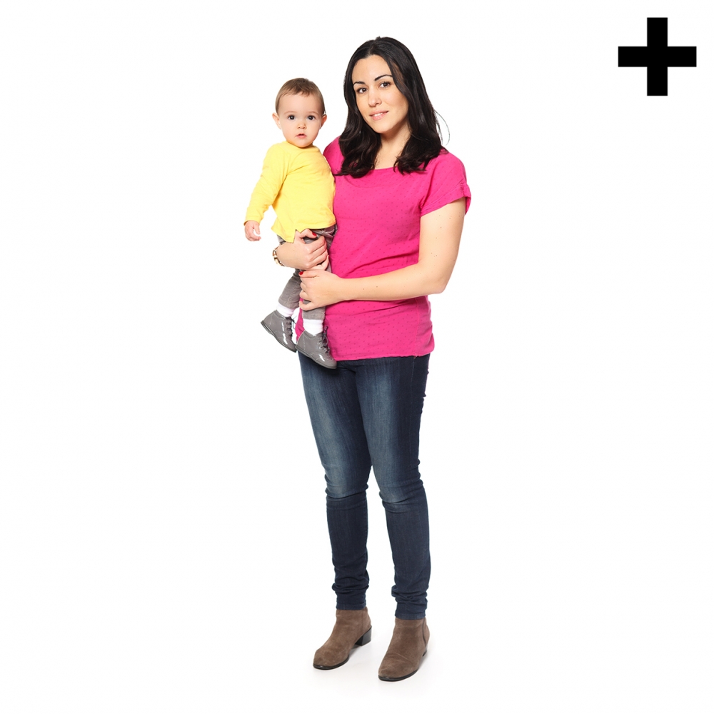 Imagen en la que se ve una madre sosteniendo a su hijo en brazos de cuerpo entero
